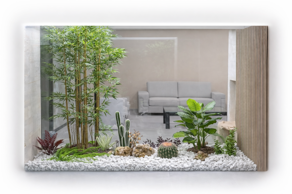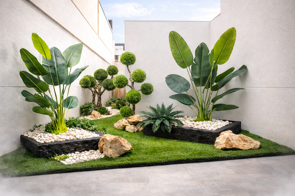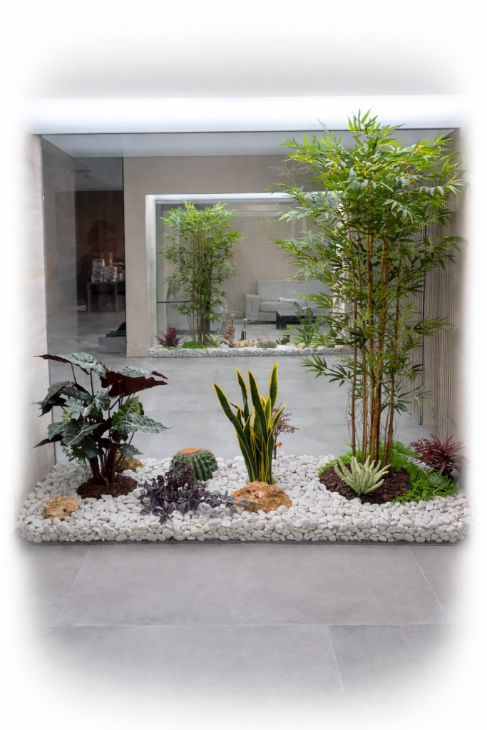 Combinamos vegetación artificial con materiales seleccionados cuidadosamente para lograr un acabado natural y armónico.